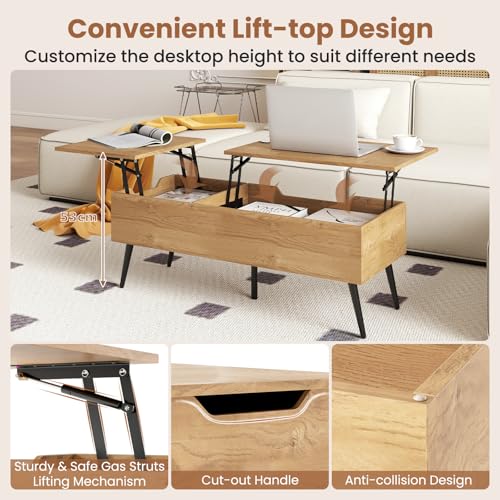 - 【Convenient Lift-top Design】Once raised, the desktop of this lift up coffee table can extend to a height of 53cm. This optimal height also provides a generous workspace or dining surface. The gas struts lifting mechanism features soft-close design that ensures safe and smooth operation.