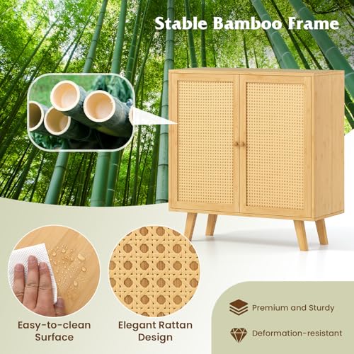 COSTWAY Rattan Storage Cabinet, Bamboo Buffet Sideboard with 2 Magnetic Door & Anti-slip Foot Pads, Freestanding Display Organiser Cupboard for Kitchen, Dining Room, Living Room, Hallway