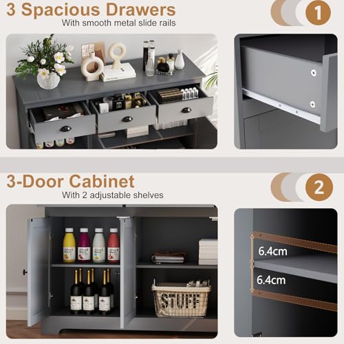 - 【Stylish Outlook and Versatile Usage】 The kitchen buffet features a gray finish of a simple and elegant style and adds a sense of elegance to match with any of home styles. The buffet sideboard can be used as a storage cabinet in the living room, or a cupboard in the kitchen. It is a functional storage cabinet, perfect for your kitchen, bedroom, entryway, hallway, etc.