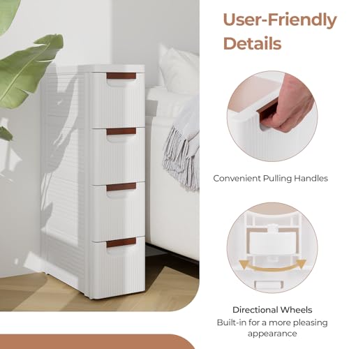 COSTWAY Slim Bathroom Floor Cabinet, Mobile Narrow Bathroom Storage Unit with 3/4/5 Drawers and Wheels, Freestanding Compact Cupboard Organiser for Living Room Bedroom (4-Drawer, White)