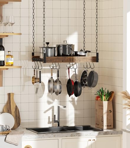 • Durable and Sturdy Materials: Crafted with rust-resistant iron frame, natural wood shelves and solid metal wires, this hanging pot rack can support up to 80 lbs, ensuring stability and safety when storing or retrieving even your heaviest cookware for heavy-duty everyday use