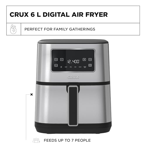 CRUX 6 L Digital Air Fryer with Nonstick Removable Dishwasher Safe Pan and Crisping Tray, 6 Preset Cooking Options, Adjustable Temperature Control, Stainless Steel