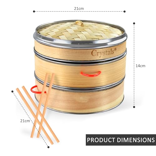 Crystals Bamboo Steamer Basket with Lid – 2 Tier Dumpling Steamer Basket for Cooking – Includes 2 Pair Wooden Chopsticks Reusable, 1 Ceramic Plate, 1 Ceramic Dipping Bowl