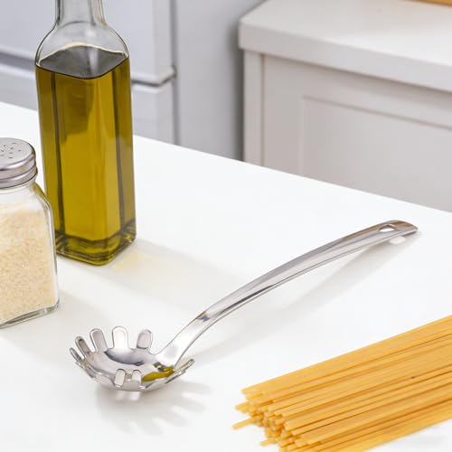- Extended Ergonomic Handle: With a long handle, this pasta serving spoon safeguards your hands from burns during deep pot cooking while enhancing comfort and safety for all culinary tasks.