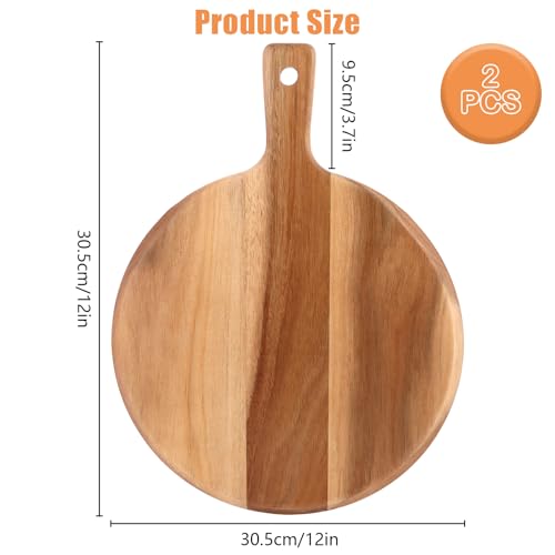 CYEER 2Pcs Pizza Board, 12 Inch Round Wooden Chopping Boards Wood Cutting Board with Handle, Cheese Board Bread Boards Food Serving Board for Pizza, Cheese, Fruits, Vegetables, Bread