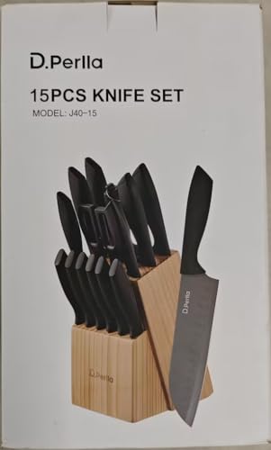 D.Perlla Knife Set with Block, 15 Pieces Kitchen Knife Set, Non Stick Black Colour Coating Stainless Steel Blade, No Rust, Sharp Knife Block Set