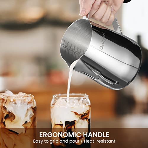 - ☕【CLEAR MEASUREMENT SCALE】Unlike other milk jug, our milk jug for coffee machine has clear internal graduated measurement lines, making it easier to control the amount of milk or cream per cup of coffee. Also you can use it to measure any liquid like serving milk, cream, water, juices, batter mixes, smoothies etc.