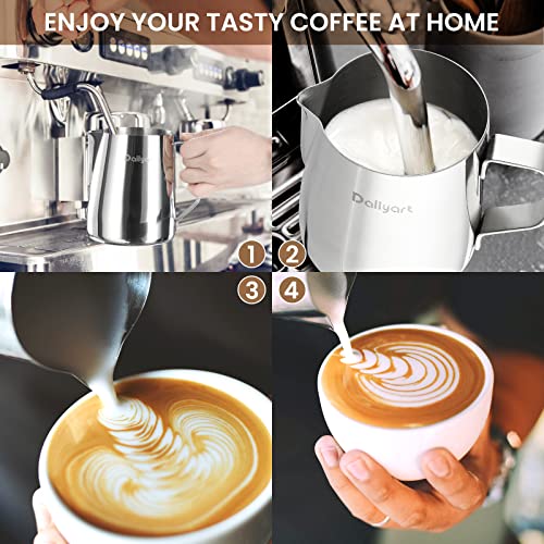 - ☕【DRIPLESS SPOUT DESIGN】It ensures that the milk frother jug is poured slowly and precisely without dripping, and the perfect latte art won't mess. Now you are free to use your imagination and creativity! Just with a little practice and the right "tools", you can create beautiful patterns on your cappuccino like a pro.