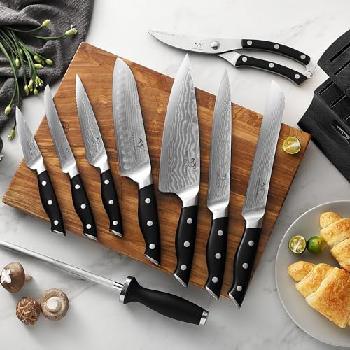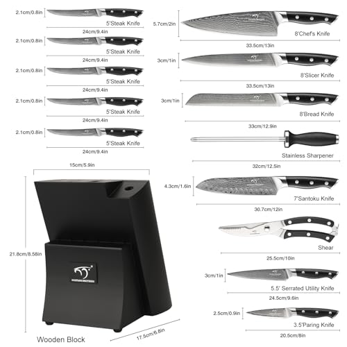 - All in One Complete Set: Professional Damascus Knives set includes 8" Chef Knife, 8" Slicing Knife, 8" Bread Knife, 7" Santoku Knife, 5.5" Utility Knife, 3.5" Paring Knife, 6 Pieces 5" Steak Knives, Kitchen Shears, Knife Sharpener to stay sharp and wood Block.