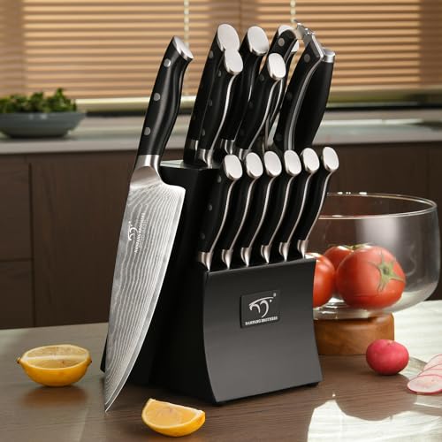 NANFANG BROTHERS Damascus Knife Set with Block 15pcs,Damascus Knives Set Damascus Steel, Japanese Professional Kitchen Knife Set with Wood Knife Block Black