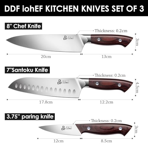 • 【MULTI-PURPOSE KITCHEN KNIFE SET】: DDF iohEF 3 PCS kitchen knife set includes ultra sharp 8" Chef Knife, 7" Santoku Knife, 3.75" Paring Knife. This knife set can be used for your daily kitchen tasks and fit all your needs.