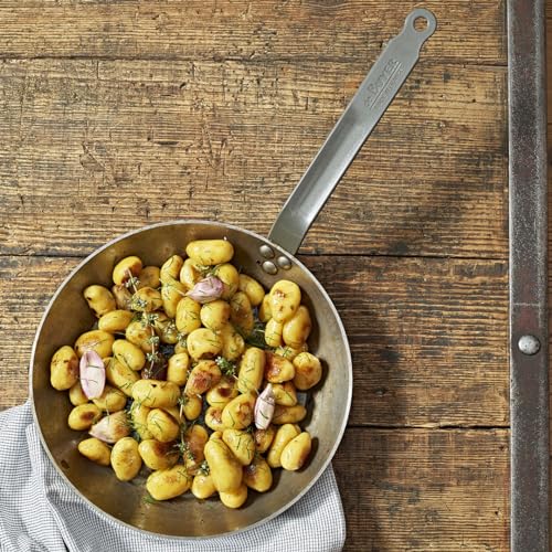 - Natural, resilient, and uncoated: following initial baking, the non-stick capability enhances with every usage. Crafted from rolled steel: 2.5 to 3 mm thick. The handle is securely riveted, ergonomically designed and angled away from the heat source.