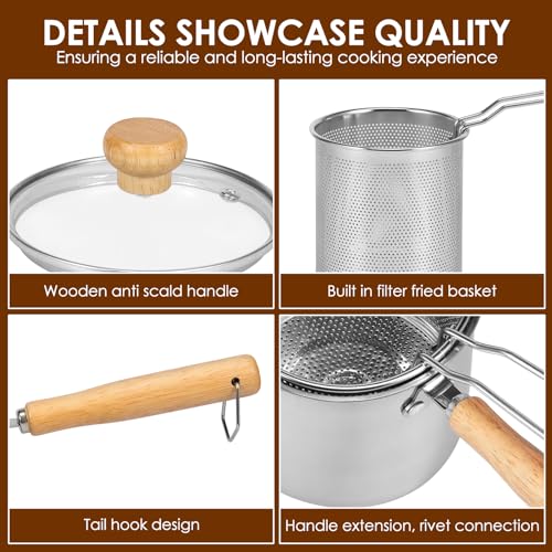 [Integrated Frying Filter Basket & Extended Handle] This stainless steel fryer pot features a built-in filter basket that removes impurities, making fried food healthier and tastier. The extended handle is safe and easy to use, preventing burns. Besides frying, it can also be used for soups, noodles, porridge, and boiled milk.