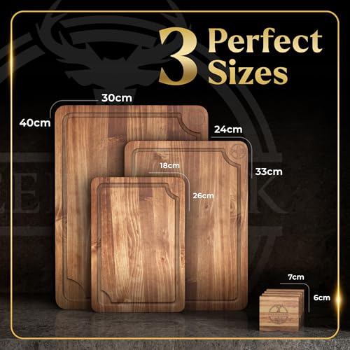 - ✔ CHILLIES TO CHOPS – THE RIGHT SIZE FOR EVERY DROP: These boards come in three practical sizes—40 x 30cm (Large), 33 x 24cm (Medium), and 26 x 18cm (Small), all 2cm thick—perfect for everything from mincing garlic and herbs to carving roasts and large cuts of meat. Built-in juice grooves prevent countertop messes by catching drips and spills.