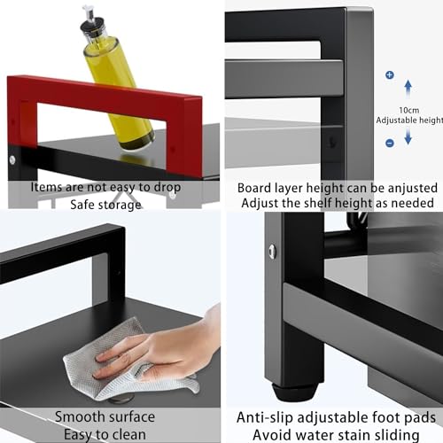 - Expandable Design: The length and height of the kitchen microwave rack can be extended, the length ranges from 40-64cm, the upper shelf ranges from 25.5-44cm, and the lower shelf ranges from 27-37cm, freely adjusted according its size to fit your needs and save space in your kitchen.