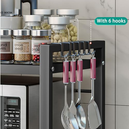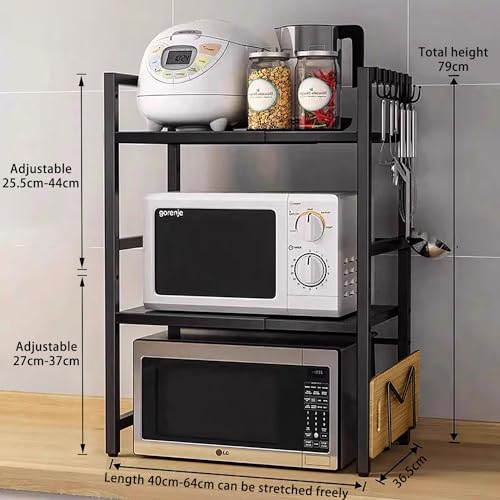 devesanter Expandable Microwave Oven Rack 3 Tier Microwave Stand,with 5 hooks Adjustable Width & Height Kitchen Counter Organizer Shelf Stand, Pot Pan Grill Storage Racks, Width 40-64cm Black