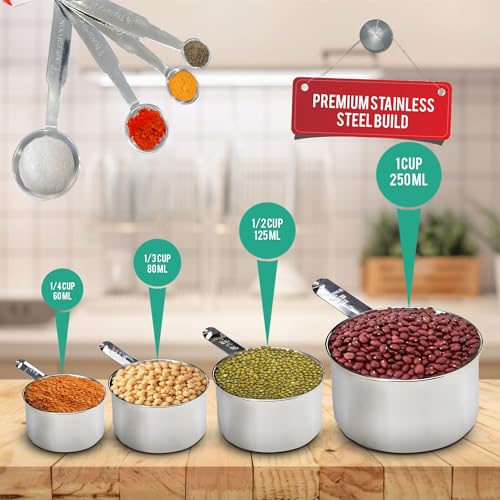 - 8-Piece Measuring Set – Stainless steel measuring cups & spoons for accurate dry & liquid measurement. Cups: 1/4 (60ml), 1/3 (80ml), 1/2 (125ml), 1 cup (250ml). Spoons: ¼ tsp (1.25ml), ½ tsp (2.5ml), 1 tsp (5ml), 1 tbsp (15ml).