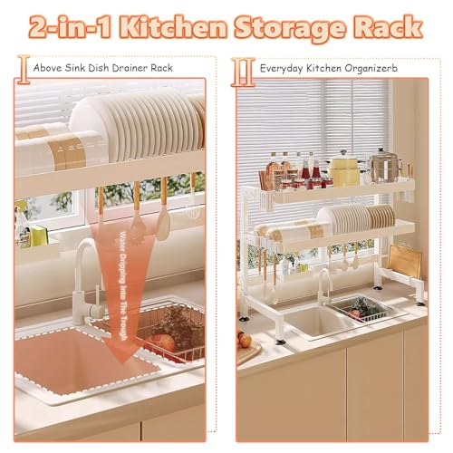 - 2-in-1 Over-the-Sink Dish Drainer: This innovative Kitchen Dish Rack allows for washing dishes while directing water straight into the sink. It creates extra space above for storing cooking utensils and daily necessities, optimizing your kitchen area and improving organization.