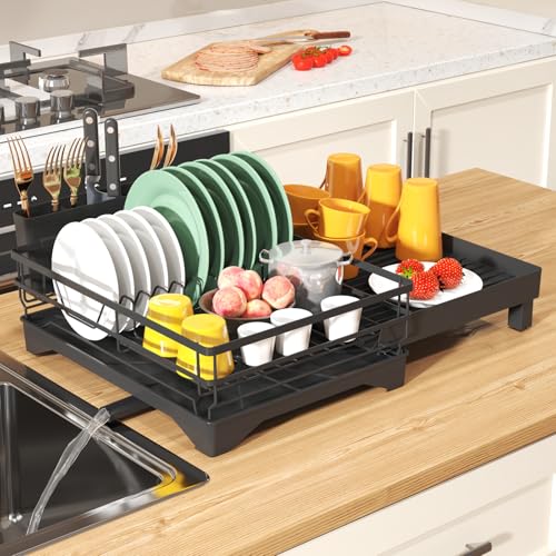 Dish Drying Rack, Expandable Dish Drainers for Kitchen Counter, Extendable Large Dish Strainer with Cutlery Holder, Plate Storage Racks Organizer Dish Dryer Drainer