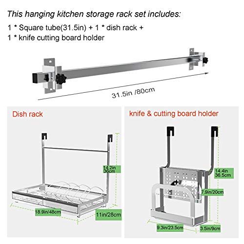 - Kitchen Storage Orgainzer Set: The set includes: 1 square tube rod(31.5in/80cm), 1 foldable dish drying rack, 1 knife cutting board holder and 3 mobile hooks