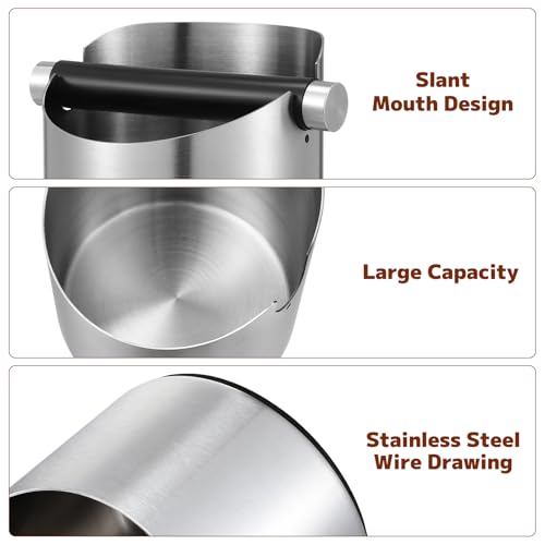 - Coffee Grind Knock Box Coffee Bin — Our coffee knock box is crafted from quality stainless steel, durability and sturdiness. The polished surface and smooth edges prevent any sharpness, making it safe to clean and handle without scratching your hands