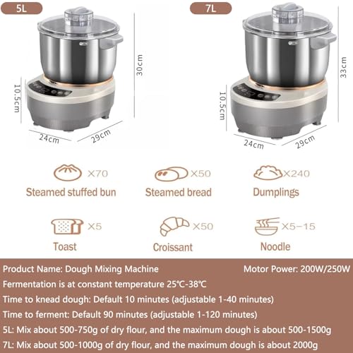 - ►【LARGE CAPACITY FOR CONVENIENT BAKING】 This dough kneading machine features a spacious 5L/7L capacity, making it ideal for large families or those who like to cook in large quantities. Thanks to its non-stick stainless steel body, the dough glides effortlessly, imitating manual kneading and ensuring a smooth and homogeneous dough.