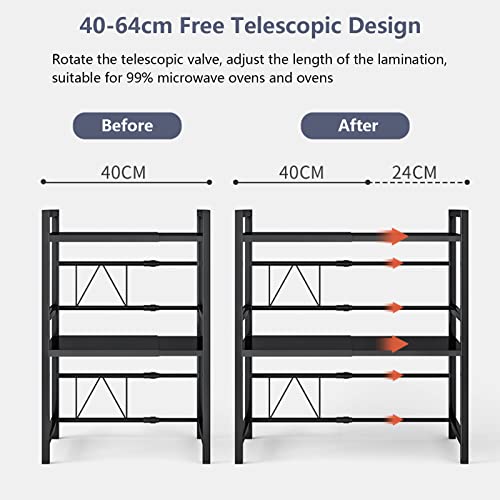 • EXPANDABLE KITCHEN SHELF: The length of 3-tier microwave oven shelf can be adjusted from 40 to 64 cm. Large 3 tier storage shelf allow you to store your microwave oven and rice cooker, or two microwave oven, and some dishes, spices, pot and pan