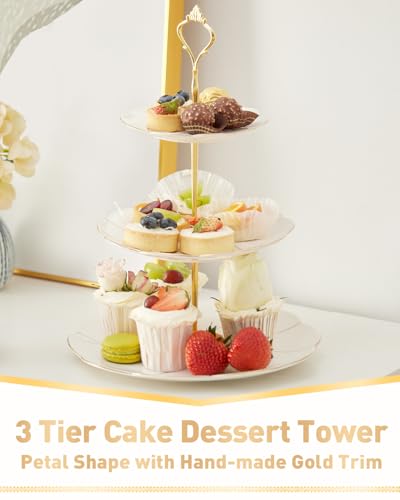 DUJUST Luxury Porcelain 3-Tier Cupcake Stand Tower, British Style Serving Tray with Golden Trim, Food Grade Dessert Display Stand, Beautiful Gift for Tea Party & Home Décor
