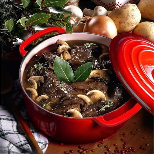 Dutch Oven Pot with Lid, Multi-functional Non-stick Enameled Cast Iron Cookware with Lids, Dutch Cooking Pot with Thread Pattern, for Oven or Stovetop Use, Cook Soups, Stews, Chicken(Red)