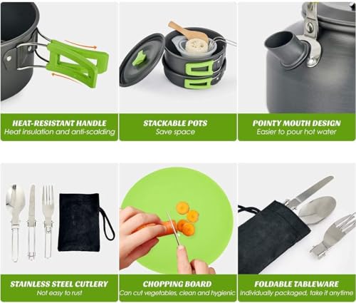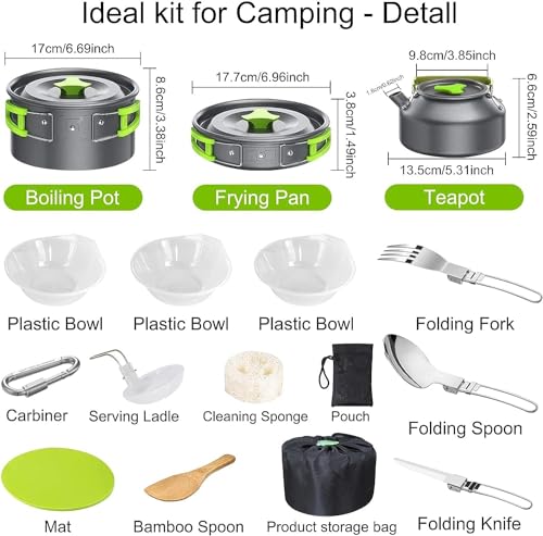 - ✅ COMPLETE CAMPING COOKWARE KIT: You get pretty much everything you need !!! Our camping pot set comes with 16 pcs of equipment: 1 Non Stick Pan, 1 Boiling Pot, 1 Kettle, 1 Folding Knife, 1 Fork, 1 Spoon, 3 Fda Bowl, 1 Serving Ladle, 1 Bamboo Spoon, 1 Cleaning Sponge, 1 Carabiner, 1 Nylon Travel Bag. 1 cutting board/mat Ready for immediate departure !