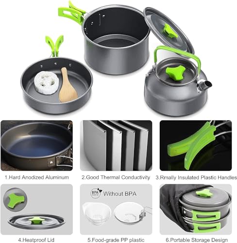 - ✅ EASY CLEAN, NON STICK COATING: The Camping cooking pan set is well-designed, surface covered with a nonstick Teflon coating for easy cleaning and durability.The Portable Cooking cooking set is multi-purpose and can solve various camping needs, such as boiling water and cooking various foods outdoors. Make delicious meals for camping