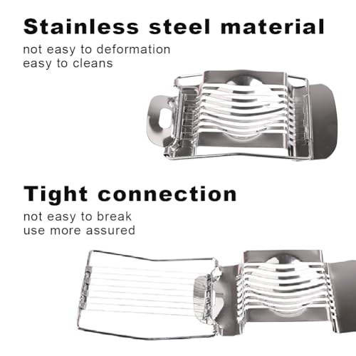 - 【Multifunctional Egg Slicer】This stainless steel egg cutter has a perfect egg groove, the eggs will not slip off during the egg cutting process; save you the time and effort of cutting eggs, not only can slice eggs, but also slice other soft Sexual foods such as strawberries, bananas, kiwi, mushrooms, butter, cheese, tomatoes, etc.