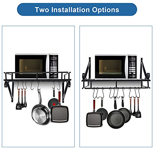 - 【Ample Storage Capacity】The length of the wall mount pot pan rack is 45cm, comes with a shelf as well as 10 hooks that can be used to hang pots and pans. These hooks can take the weight of your pots and pans without breaking or snapping as the entire product is made of iron