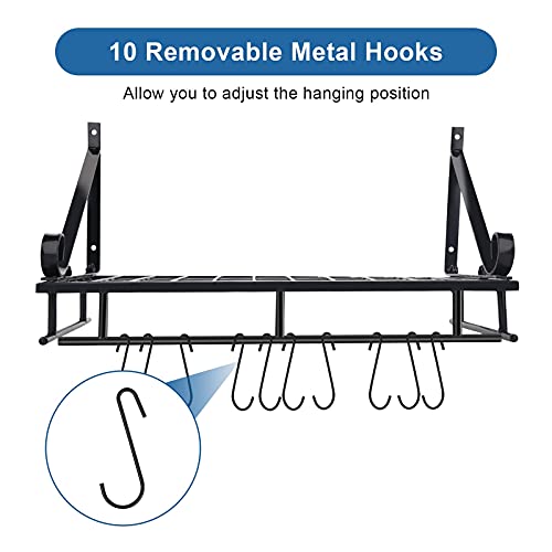 Ejoyous Wall Mount Pot Pan Rack, 45CM Saucepan Hanging Rack Multifunctional Utensils Holder Shelf Metal Cookware Organiser with 10 Hooks, Black