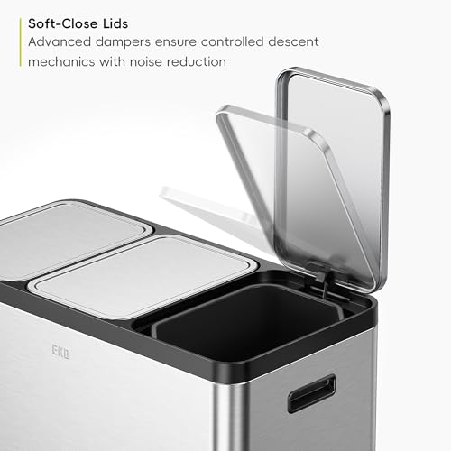 EKO Ecocasa Recycling Bin 20L+20L+20L, Stainless Steel 3 Compartment Rubbish Bin with Individual Pedals for Kitchen Waste Separation, Plastic Inner Buckets and Handles, Soft Closure, Matt Metallic
