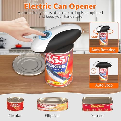 - One-Touch Automatic Operation: Simply place the can opener on the can and press the button. The electric can opener automatically rotates 360° around the lid for a smooth cut. After one full rotation, press the button again to automatically peel the lid off. Ideal for seniors, arthritis sufferers, and those with limited hand strength