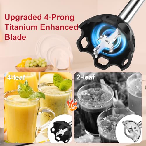 - Non-Scratch Feature: The hand blenders for kitchen features an anti-scratch, anti-splash semi-wrapped blade guard designed to protect your container, prevent splashing, and keep food from getting stuck. The sharp stainless steel blending blade guard specifically protects non-stick cookware. The scratch-resistant blade guard allows you to blend directly in deep pots or pans without scratching them. Choose any of your pots or pans; don’t worry about scratching them. ZOAYBU upgraded 4-leaf titanium; others have only 2 leaves.