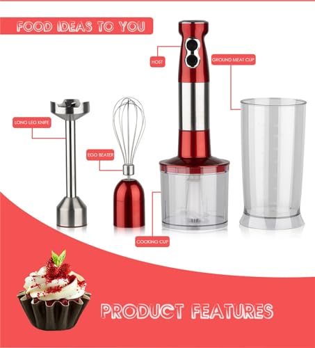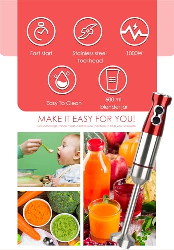 - ERKIES Hand Blender, 4-in-1 Stick Blender 1000W, 2 Speeds Adjustable, Baby Food Blender, with Stainless Steel Blade and BPA-Free, for Baby Food, Smoothies, Soup (Red)
