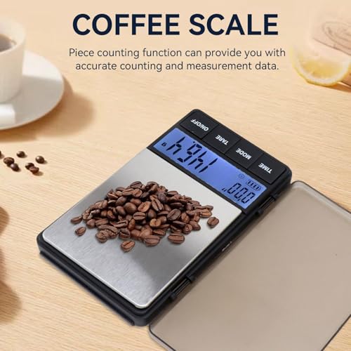 • MULTIFUNCTION: Electronic coffee scale with timer with piece counting function for faster quantity measurement. Also the hold function will lock the weight reading. Electronic cooking scale is suitable for both home and professional use, accommodating different brewing preferences and recipes.