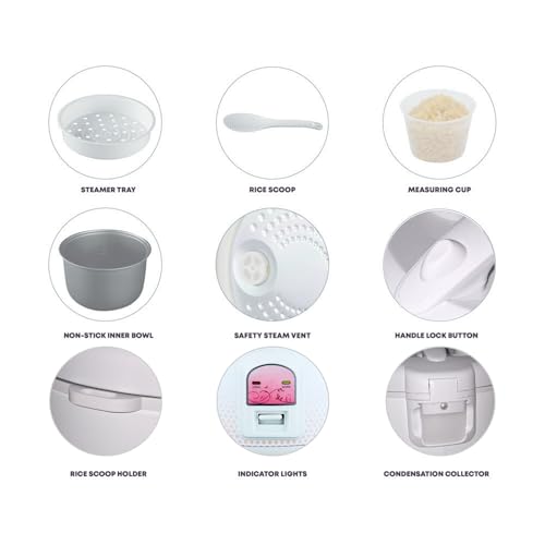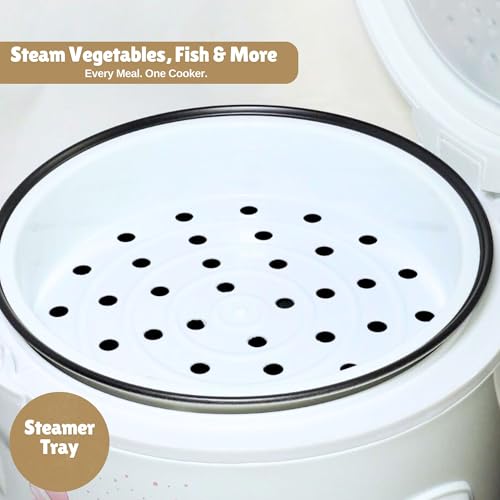 - COMPLETE ACCESSORIES: Includes measuring cup and serving spatula for precise portions, plus a steaming tray for vegetables