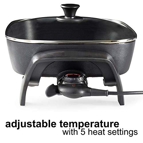 - ADJUSTABLE TEMPERATURE – The skillet pan features an adjustable temperature, with 5 different settings that can be adjusted quickly. This means you can ensure your food is cooked perfectly through, without the risk of burning your dinner or leaving it underdone. The trigger-release temperature control plug can also be easily detached, ready for when you need to clean the pan.