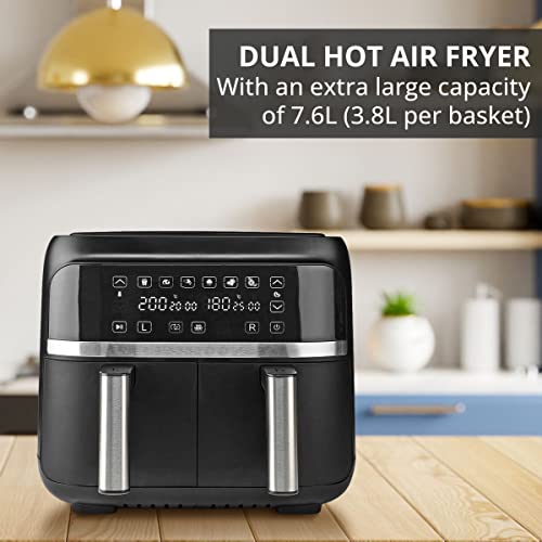 - 7.6L HOT AIR FRYER – Fry, grill, bake and roast with this easy to use digital hot air fryer, for fast and great tasting food. With it's dual basket design, this 7.6L fryer has two independent 3.8L baskets, ideal for cooking different foods at the same time.