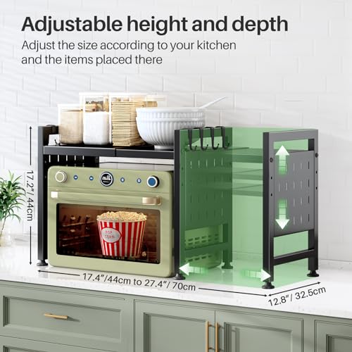 - Expandable & Height Adjustable: This Kitchen Oven Rack can be adjusted both horizontally and vertically, making it ideal for various kitchen spaces. The Adjustable Microwave Shelf extends from 17.4 inches (44 cm) to 27.4 inches (70 cm) wide. With 3 height options, you can easily customize the rack to fit your countertop and microwave perfectly, enhancing your kitchen nization.