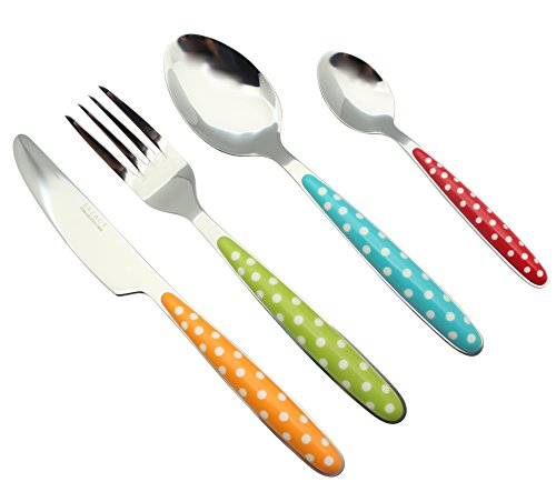 EXZACT Cutlery Set 24pcs Polka Dot Mixed Colours, Stainless Steel with Color Handles – 6 Forks, 6 Dinner Knives, 6 Dinner Spoons, 6 Teaspoons -Dishwasher Safe (Mixed Colour x 24)