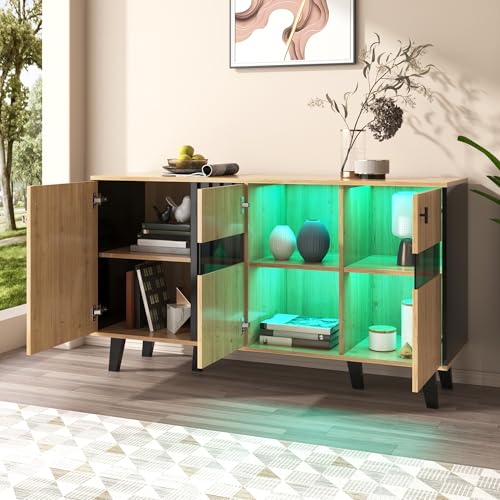 FammyLoft Sideboard with Shelves, Sideboards for Living Room, Sideborad with Glass Doors, Wood Sideboards with LED Lights, Cupboard with Storage Space for Bedroom and Kitchen, Black and Wood
