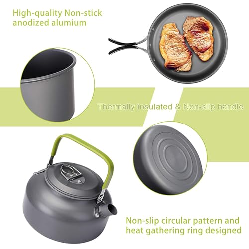 - Aluminum Alloy Construction: The pots, pans and kettles in this camping cookware set are made of high quality aluminium alloy. Aluminium alloy is not prone to rust and corrosion, and heats up quickly and evenly, allowing you to cook your food efficiently without creating hot spots.