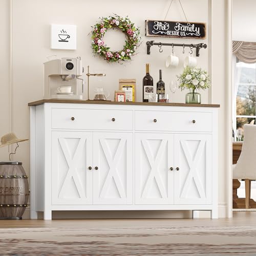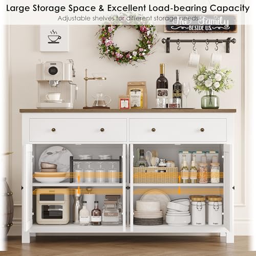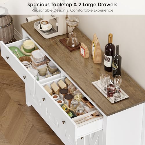 - Ample Storage Space: Our kitchen sideboard offers more space than most cabinets. The 2 large drawers are perfect for cups, cutlery, food and more. The 2 storage areas with doors include adjustable/removable shelves, so you can adjust the height of the shelves as required. Use our white sideboard to meet the need for storing different sizes of plates, pots and pans, infrequently used kitchen utensils, and more.