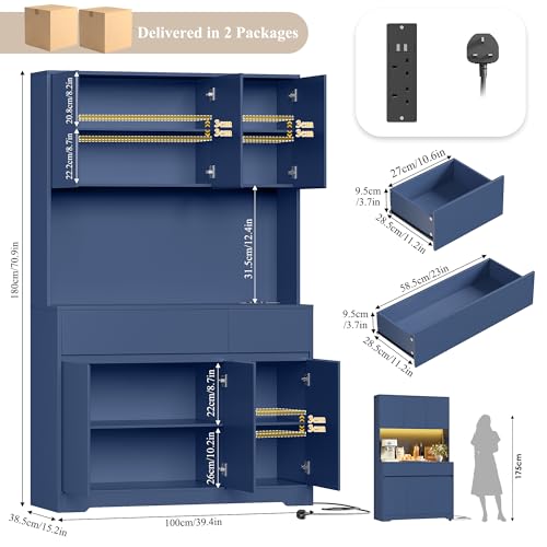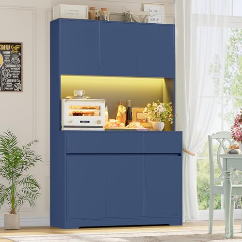 FirFurd Kitchen Cupboard 180cm Tall Cabinet Kitchen Sideboard Storage Cabinet with LED, Power Outlet, Adjustable Shelves, 2 Drawers, 6 Doors, Large Countertop 180x100x38.5 cm Blue