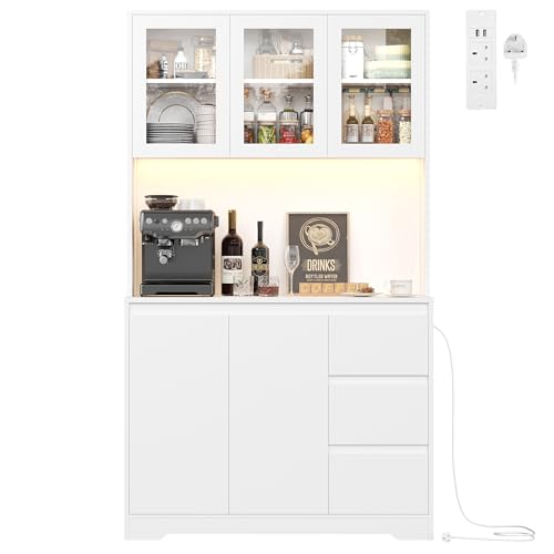 - High-quality Materials and Easy Installation: Our kitchen cabinet is made of thickened wood and toughened glass. The surface is waterproof and easy to clean. For added stability and safety, we have equipped this 180cm tall kitchen furniture with 2 anti-tilt devices. This white sideboard is shipped in 2 parcels, with part numbers and clear instructions to help you assemble it easily. (Please wait until both packages arrive before assembling)