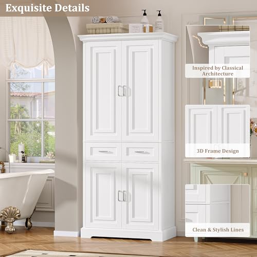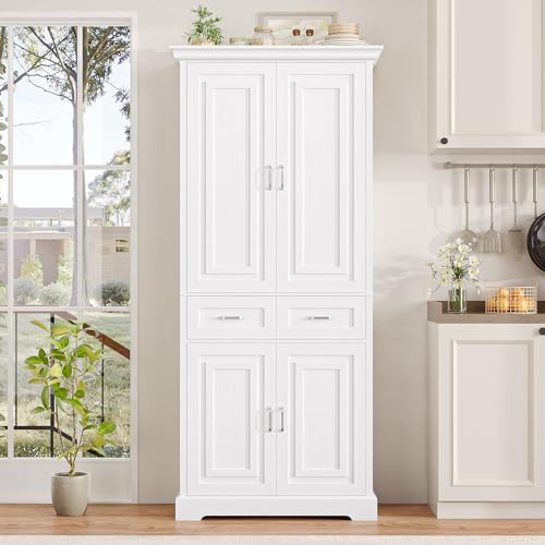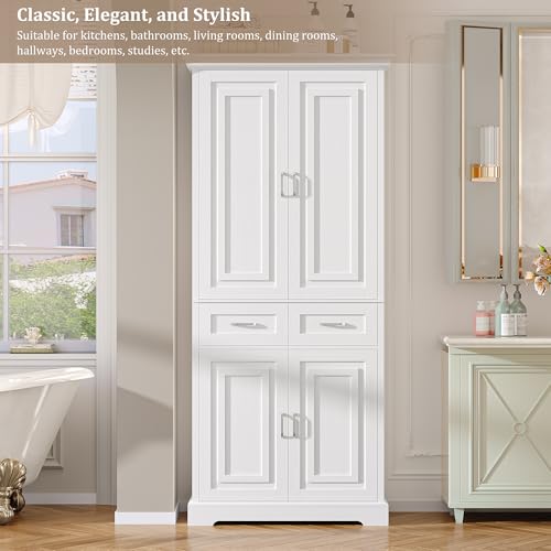 FirFurd Kitchen Cupboard Tall Kitchen Cabinet Freestanding Pantry Larder Cupboard Sideboard Storage Cabinet with 4 Doors 2 Drawers for Living Room Dining Room Bathroom 80×39.5×180.5cm White